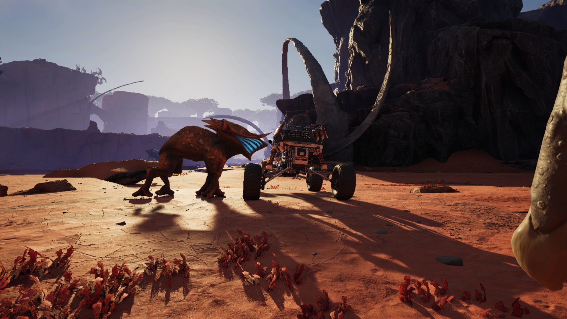 Satisfactory video game screenshot: An "alpha stinger" creature that's roughly the same size as the dune buggy vehicle it's just finished shoving sideways across the ground.