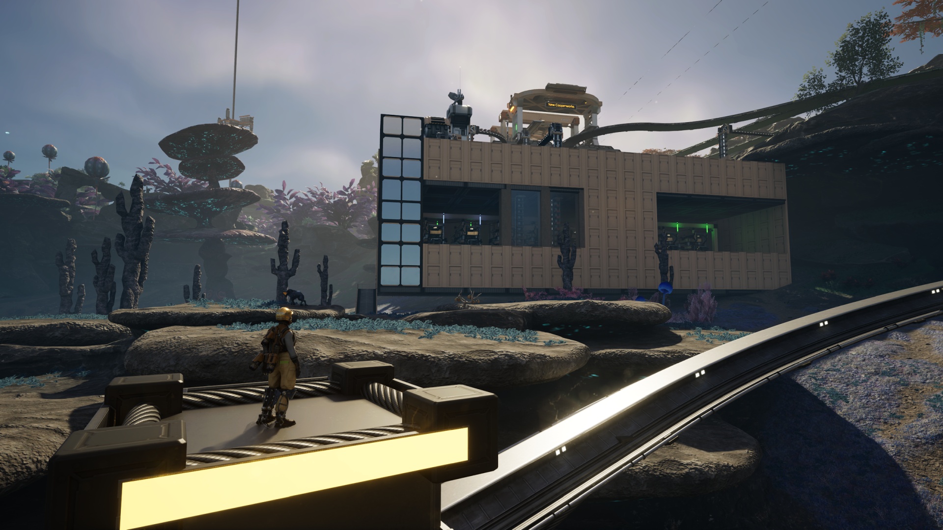 While routing the train lines down through the weird fungal-growth-looking rocky shelves wasn’t easy, this is hardly my first time threading the map’s needles with railways. Having my spiral railway blueprints from the previous save helped a bit. Within a single play session I had most of what’s needed in place.