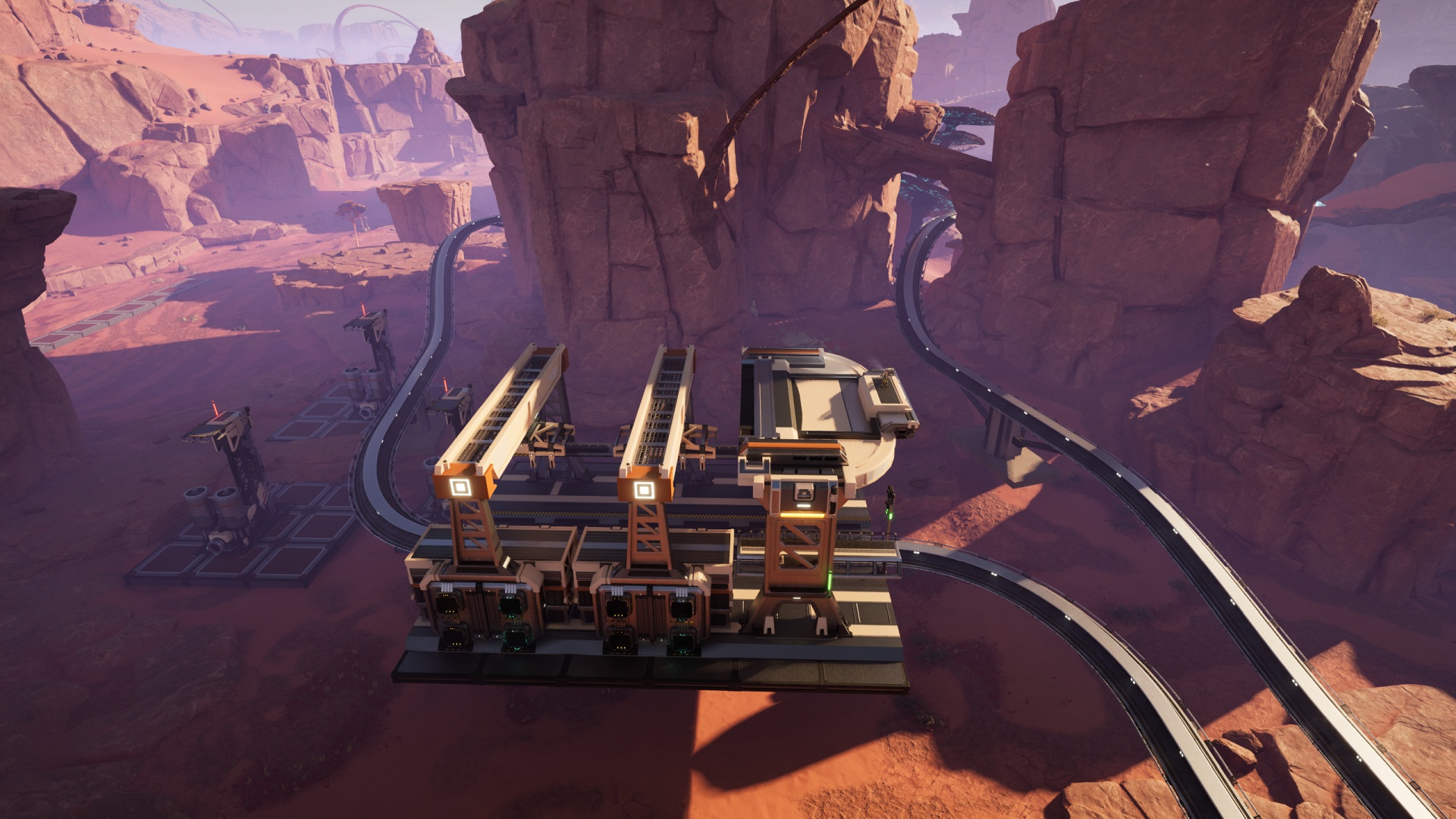 I paused at the kind-of-lousy crude oil node cluster along the way to slap down a train station and some oil wells with the intention of using that site to produce all the rubber and plastic that the Supercomputers and Turbomotors and such will need. It’s a terrible place to build, and I’m absolutely certain that the game’s developers crafted that part of the map specifically to taunt the players: “We know you’re going to get desperate enough to tap these nodes eventually. Have fun!” But as I pondered in my Discord server how to build a bunch of refineries and generators in such a lousy chunk of real estate, my daughter came up with a brilliant solution: Don’t. Just… haul the crude oil away to the Dune Desert where there’s copious open space and availability of water to take advantage of some of the fancier petro-processing tricks that water allows. Unlike a power plant situation where the issues that come with using rail transport for fluid goods could be disastrous, this is purely a goods-manufacturing project and the occasional hiccup should barely even be noticed.