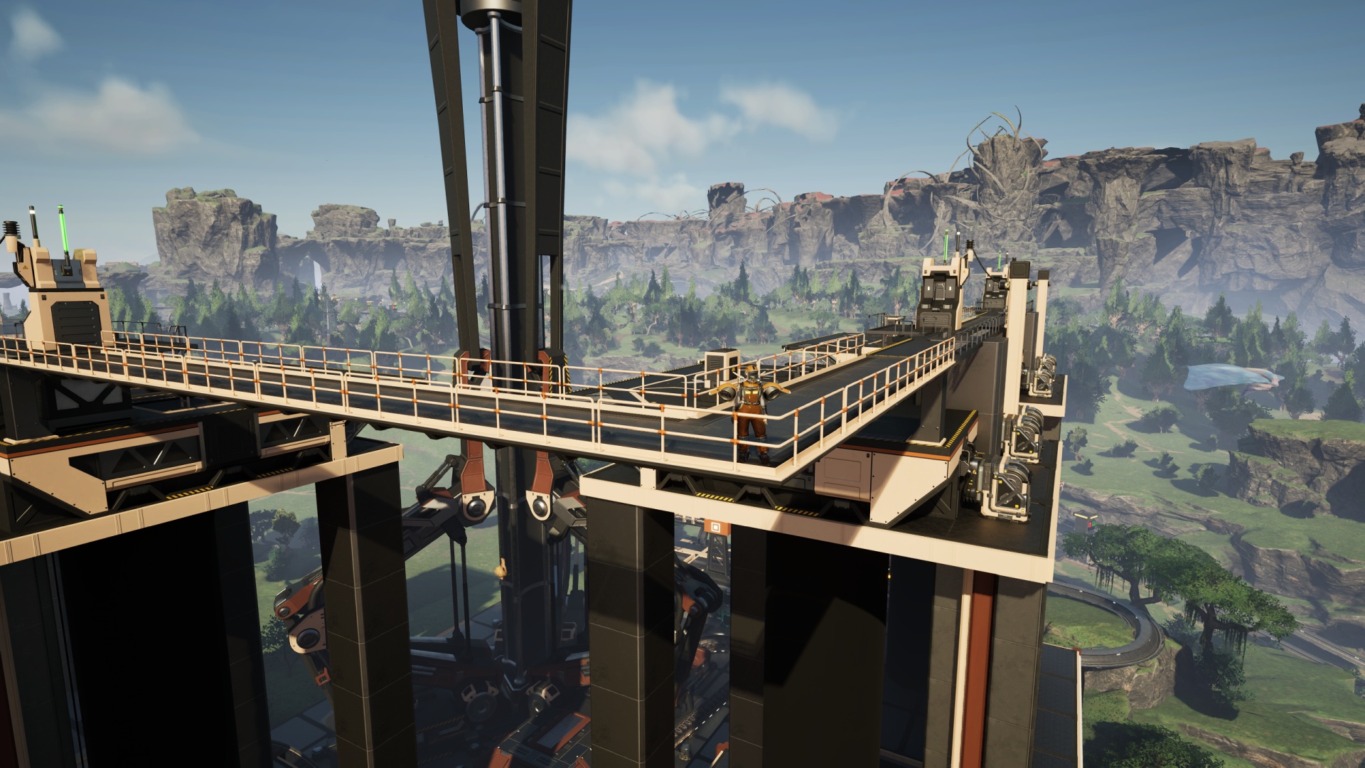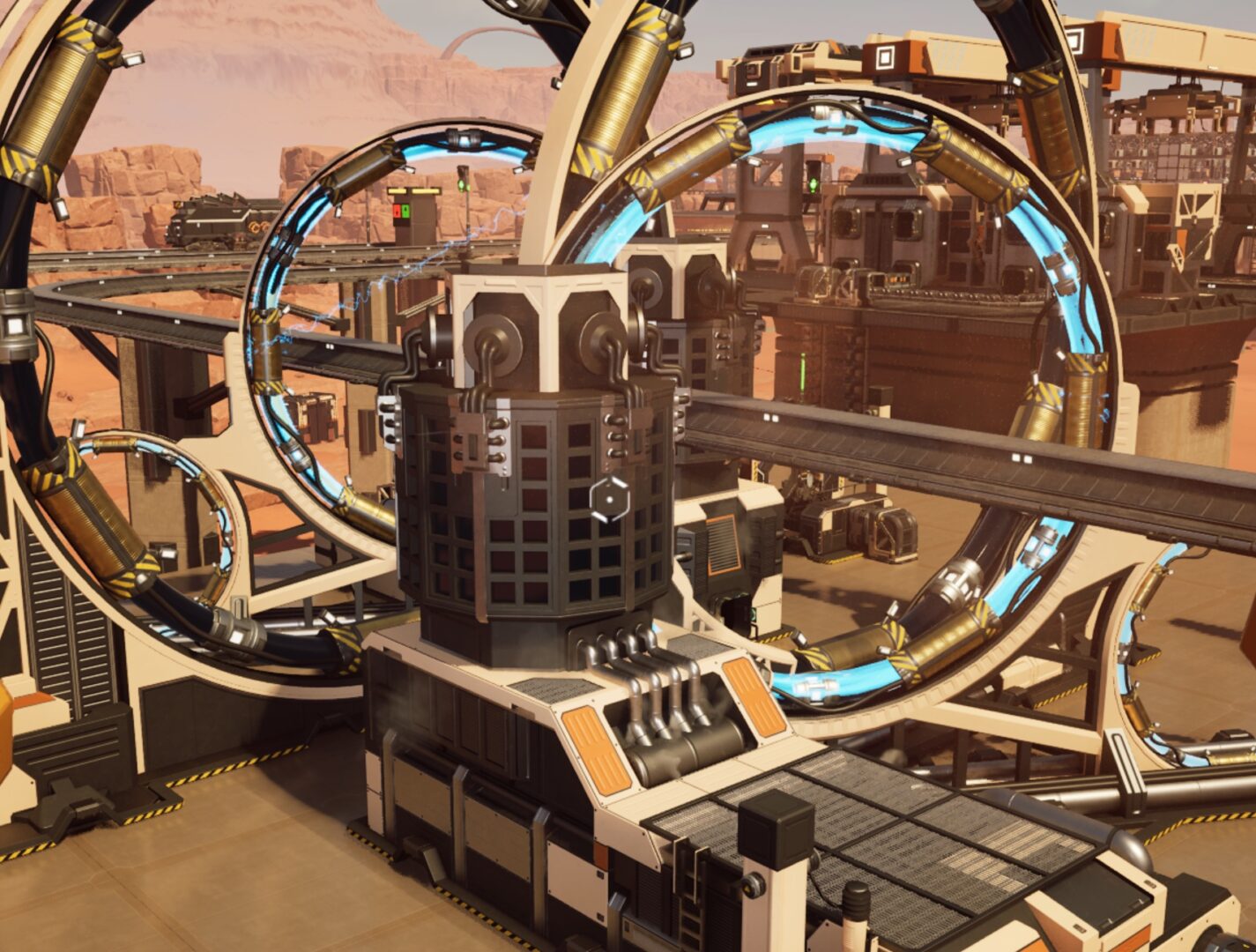 This save is by far the furthest I’ve gone into relying on drone-based goods transportation. This coincides interestingly with my forays into using the Blueprint Designer for things that aren’t railway-related. (For a change.) I built a set of modular blueprints for creating drone towers. The base includes buffer bins for the inputs & outputs, power routing, and signage. It’s just a matter of stacking the blueprints, connecting the power plugs, running conveyor lifts (input, output, and fuel) and it’s all set!